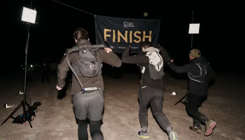 At 5.01am, after descending from the highest volcano on Earth, and covering what our watches tell us was actually about 54km (due to the summit descent and real world route constraints), we crossed the finish line on the shores of Laguna Verde, and into the waiting arms of our fully assembled support team and film crew.